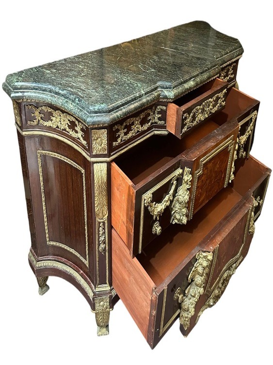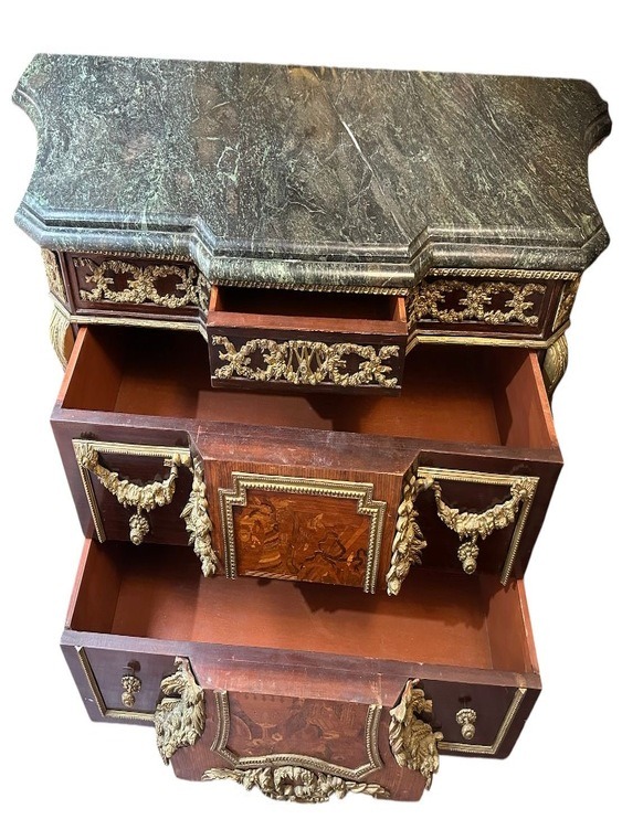 Commode à ressaut central en bois dessus marbre ouvrant par 3 tiroirs, riche l’ornement en bronze ciselé et doré, dessus de marbre.